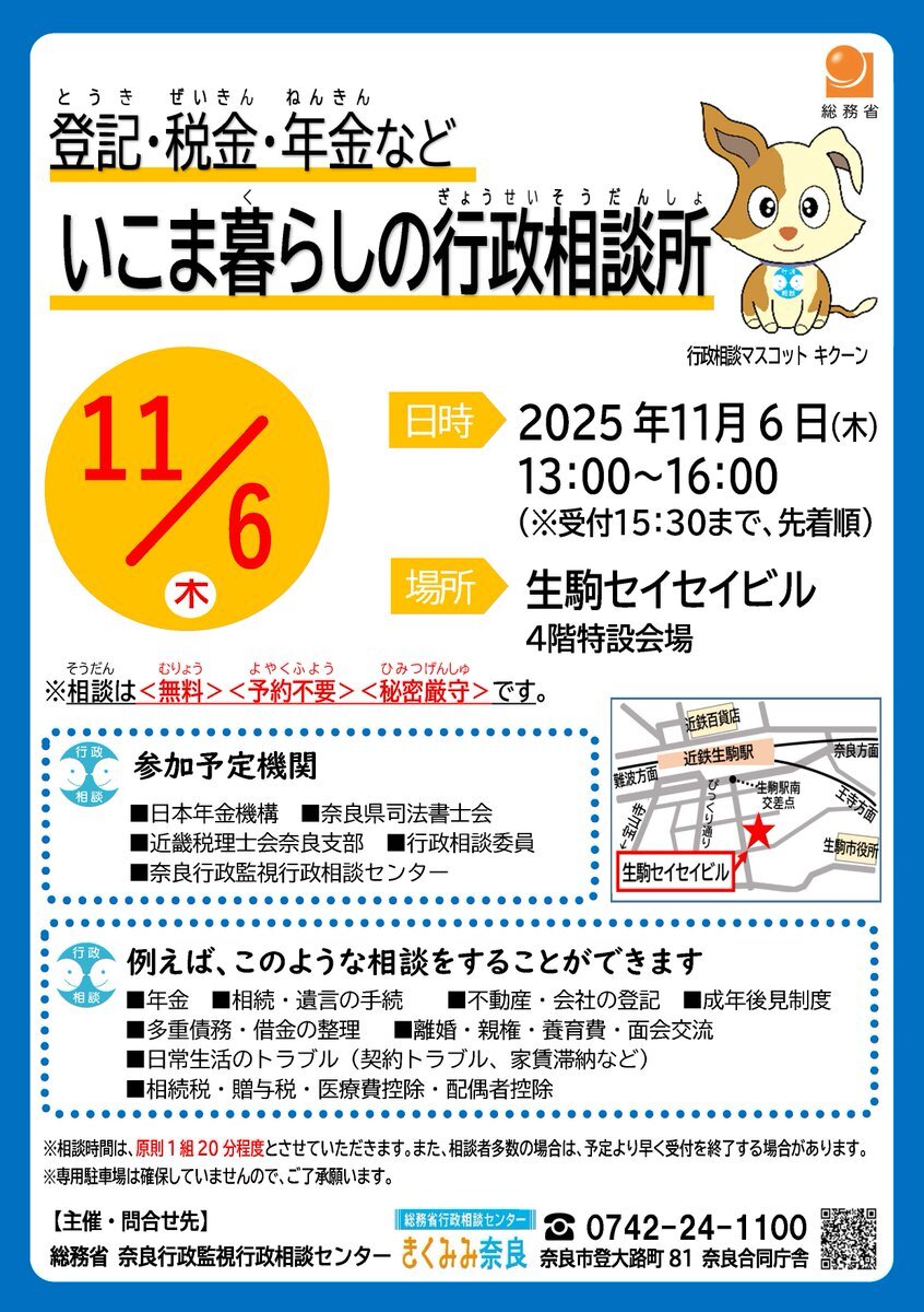 【生駒市】📣 年金や相続、登記などの相談ができる「一日合同行政相談所」が11月6日(木)に開催されます📚 予約不要・無料で、専門家に相談できる機会です🌿 #相続 #終活準備 #行政相談 #生駒市 x.com/MIC_soudan/sta…